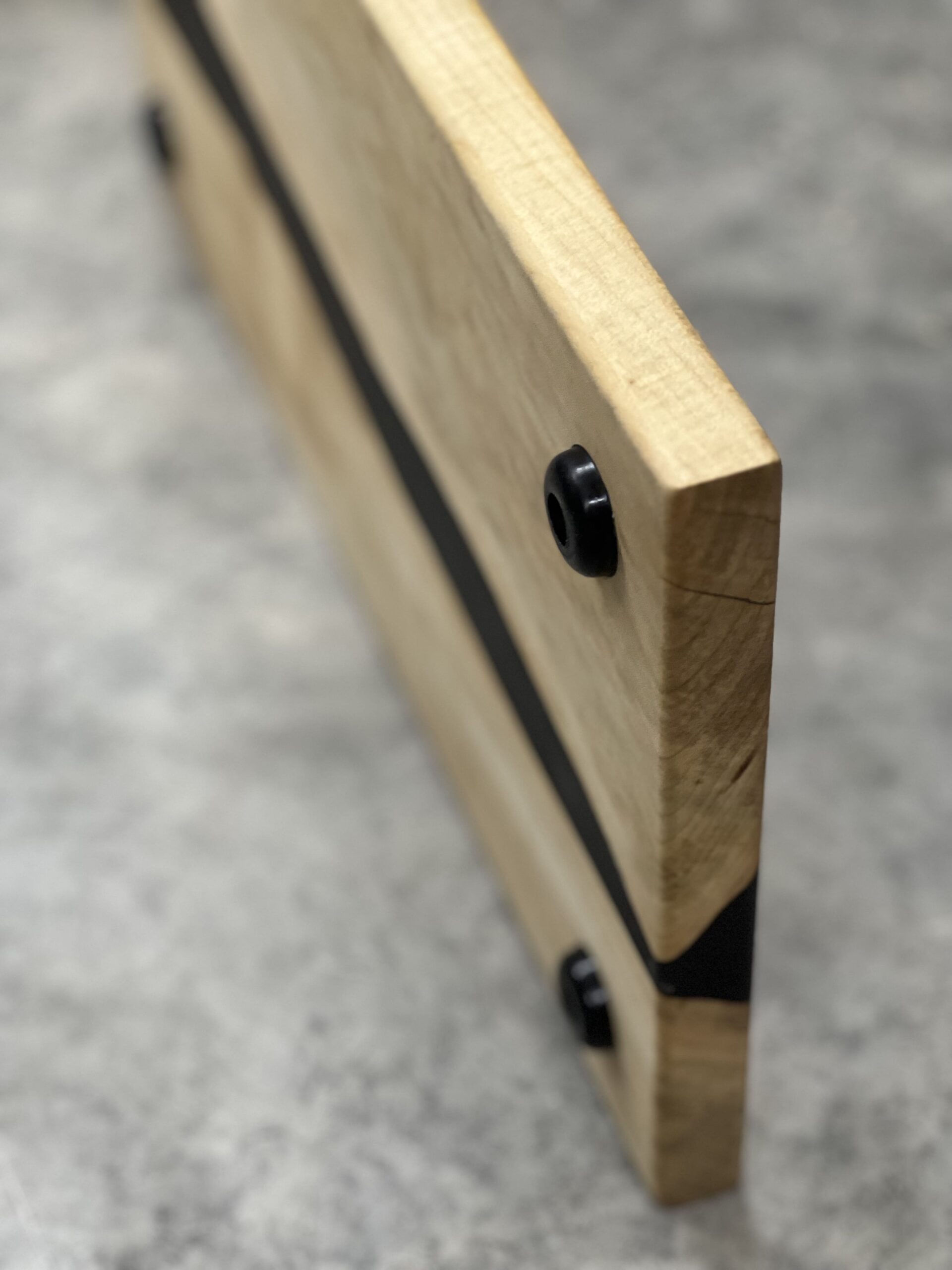 Type de bois : Érable Grandeur : 10″ x 18″ Autres informations : Epoxy noir, pattes antidérapantes